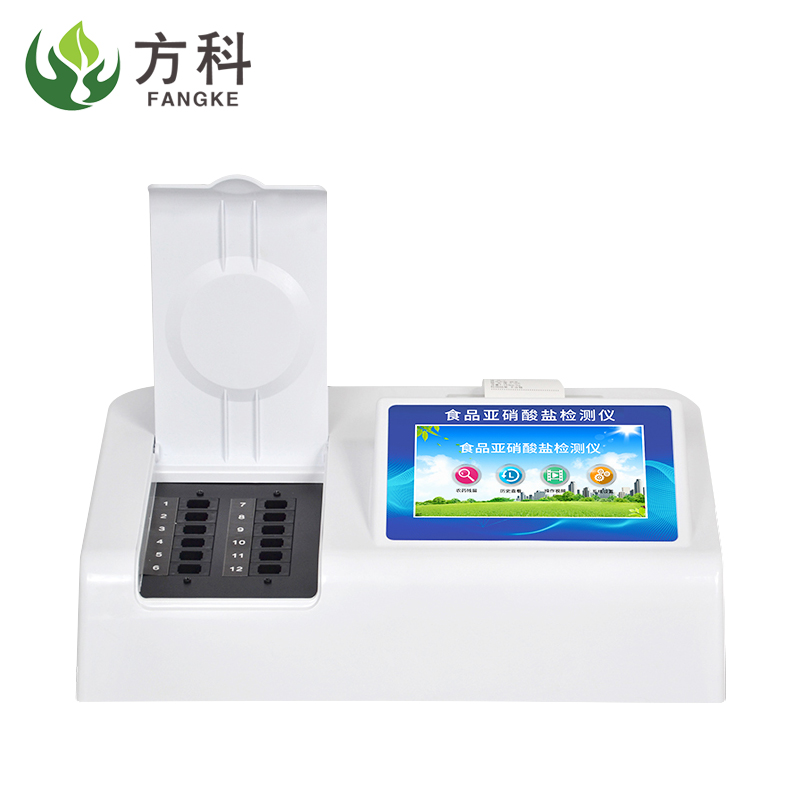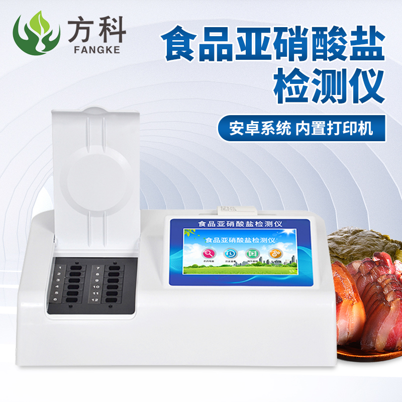 食品中亚硝酸盐快速检测仪为集成化食品安全检测分析设备,能够快速检测肉类、肉类罐头、熏肉、香肠、奶制品、泡菜、腌制蔬菜等中的亚硝酸盐含量;该仪器是根据GB5009.33-2010《食品中亚硝酸盐与硝酸盐的测定》,食品中的亚硝酸盐经过提取,与检测试剂反应生成有色化合物,再利用亚硝酸盐检测仪测定其吸光度,在一定范围内吸光度与含量成正比。通过检测可确定食品是否符合国家标准或是否为超标毒害食品等。仪器预留其他项目检测程序和端口,根据日后需求可方便的自主增加检测项目。日后可升级为检测水产品、面制品的综合类型仪器。
