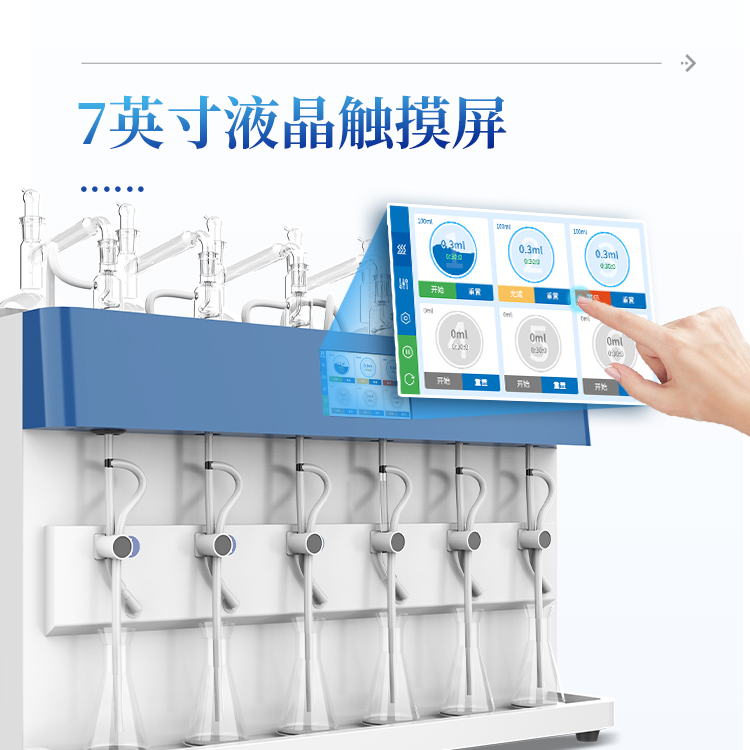 3.智能触控:7寸液晶触摸屏,支持自定义保存最多1000种蒸馏方法,内置18种国标方法。