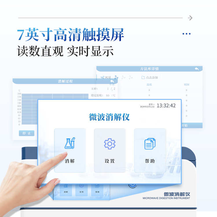 简要描述: 智能微波消解仪是一种用于样品前处理的设备,通过微波加热技术对样品进行快速、有效的消解。该仪器广泛应用于食品、环境保护、疾病控制、质量监督、商品检验、科研院所等领域,特别适用于各种样品的酸消解和溶剂萃取。